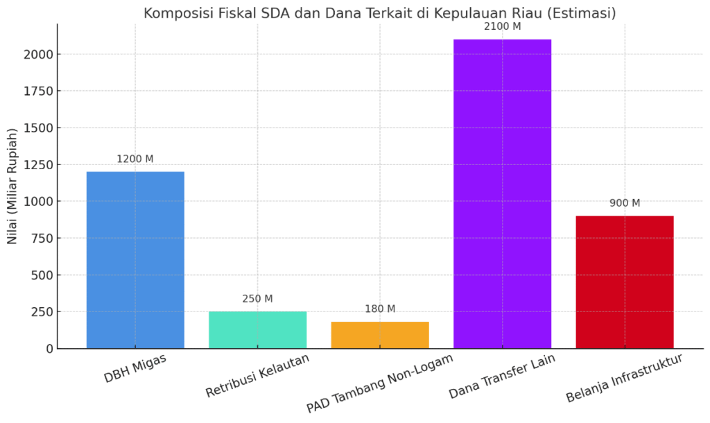 Dana Bagi Hasil (DBH) Migas merupakan sumber utama penerimaan fiskal berbasis SDA di Kepulauan Riau. Hal ini disebabkan oleh keberadaan beberapa ladang migas lepas pantai seperti Blok Natuna dan wilayah kerja di Anambas yang menghasilkan gas alam dalam jumlah besar. Meskipun sebagian besar pengelolaan dilakukan oleh pusat dan kontraktor kerja sama, pemerintah daerah tetap memperoleh persentase pendapatan melalui skema DBH sesuai UU No. 33 Tahun 2004 tentang Perimbangan Keuangan. Estimasi grafik menunjukkan bahwa DBH Migas di Kepri dapat mencapai Rp 1,2 triliun, mengindikasikan bahwa sektor energi fosil masih menjadi tulang punggung kontribusi fiskal SDA provinsi ini.