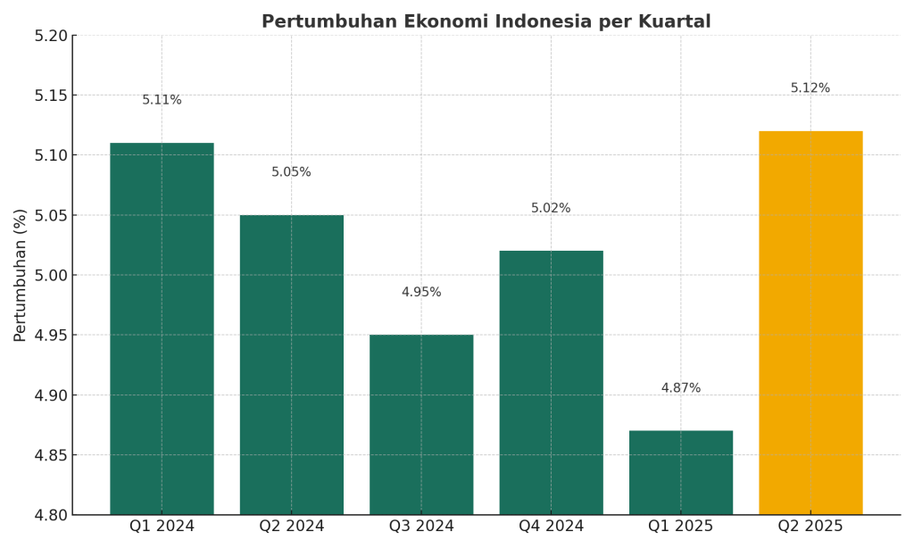 Data pertumbuhan ekonomi Indonesia menunjukkan fluktuasi moderat sepanjang periode Q1 2024 hingga Q2 2025, dengan kisaran pertumbuhan antara 4,87% hingga 5,12%.