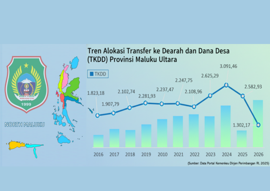 Fenomena penurunan tajam alokasi Transfer ke Daerah dan Dana Desa (TKDD) di Provinsi Maluku Utara pada tahun anggaran 2026 merupakan isu fiskal yang tidak hanya berdampak pada struktur keuangan daerah, tetapi juga pada arah strategi pembangunan jangka menengah dan panjang. Berdasarkan data historis, TKDD provinsi ini menunjukkan kecenderungan meningkat secara gradual hingga mencapai puncaknya pada tahun 2024 sebesar Rp 3,09 triliun. Namun, dua tahun berikutnya memperlihatkan penurunan signifikan, yakni menjadi Rp 2,58 triliun pada 2025 dan anjlok drastis ke Rp 1,30 triliun pada 2026, yang merupakan angka terendah dalam 11 tahun terakhir.