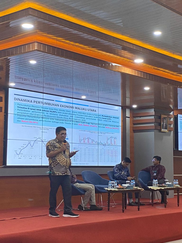 Direktur LeSPOMIK, Dr. Abdul Chalid Ahmad, S.E., M.Si sedang mempresentasikan materi diskusi panel dengan topik “Tantantang dan Peluang Pertumbuhan Ekonomi Maluku Utara”, pada kegiatan Desiminasi “Perkembangan Ekonomi Terkini dan Respons Kebijakan Bank Indonesia”, tanggal 4 November 2025 di Aula Nuku Unkhair.[*]